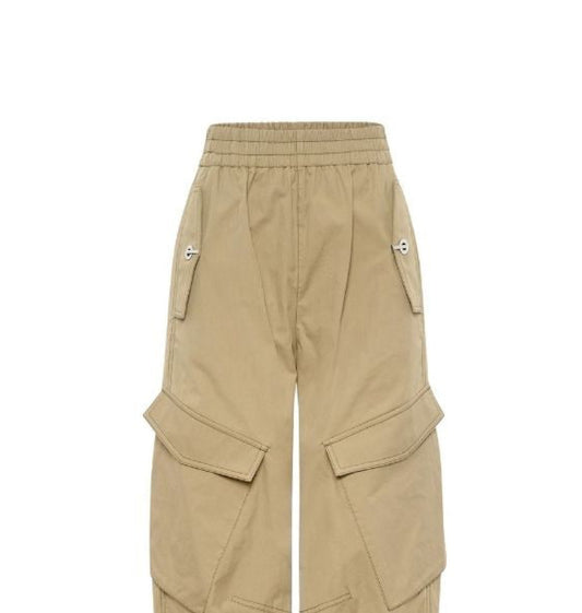 Beige straight leg cargo unisex trousers.